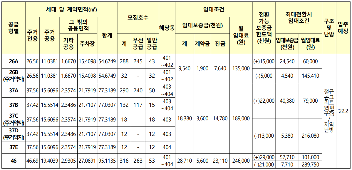 • 위 임대조건의 임대보증금 및 월임대료는 입주자모집공고일 현재 기준이며, 예비입주자로 선정된 분은 추후 공가가 발생하여 임대차계약을 체결하게 되는 시점의 변경된 임대조건이 적용됩니다.