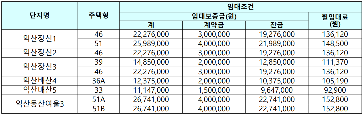 익산시 국민임대주택 임대정보 : 장신휴먼시아 1단지, 장신휴먼시아 2단지, 장신휴먼시아 3단지, 배산휴먼시아 4단지, 배산휴먼시아 5단지, 동산여울휴먼시아3단지