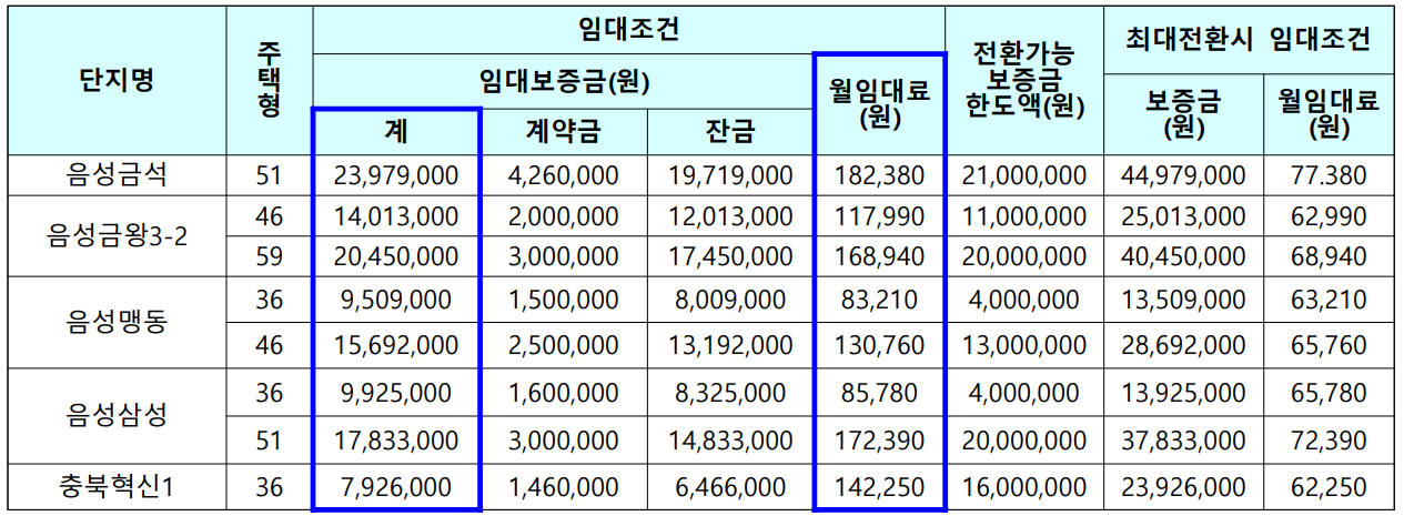 음성군 국민임대 아파트 : 음성금석아파트, 금왕주공3단지아파트, 맹동휴먼시아아파트, 음성삼성휴먼시아아파트, 천년나무1단지아파트 임대정보