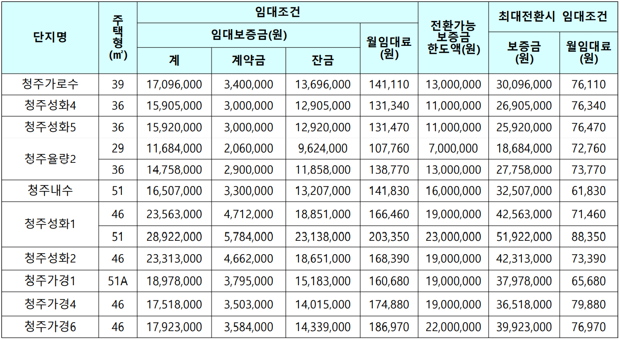 청주시 국민임대주택 : 가로수마을 휴먼시아아파트, 성화휴먼시아4단지아파트, 성화휴먼시아5단지아파트, LH청주율량2단지아파트, 청원내수아파트, 성화주공1단지아파트, 성화휴먼시아2단지아파트, 가경주공1단지아파트, 가경주공4단지아파트, 가경주공6단지아파트 임대보증금, 월임대료.