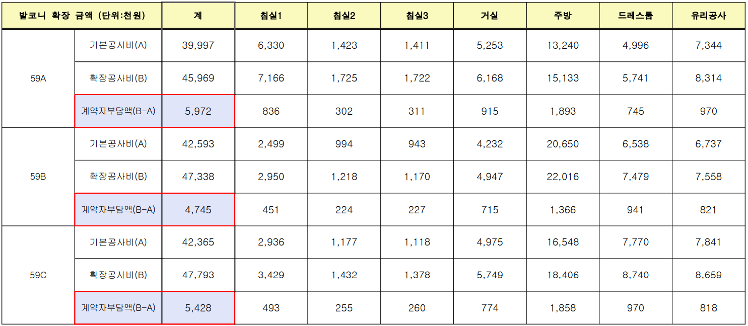 ■ 발코니 확장금액(전세대 발코니 확장시공) (단위 : 천원)