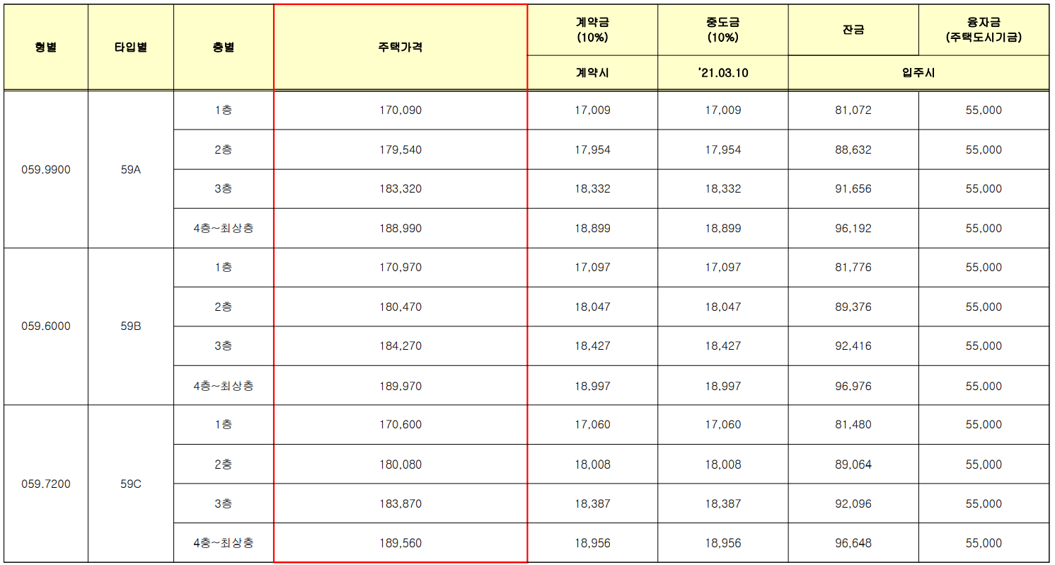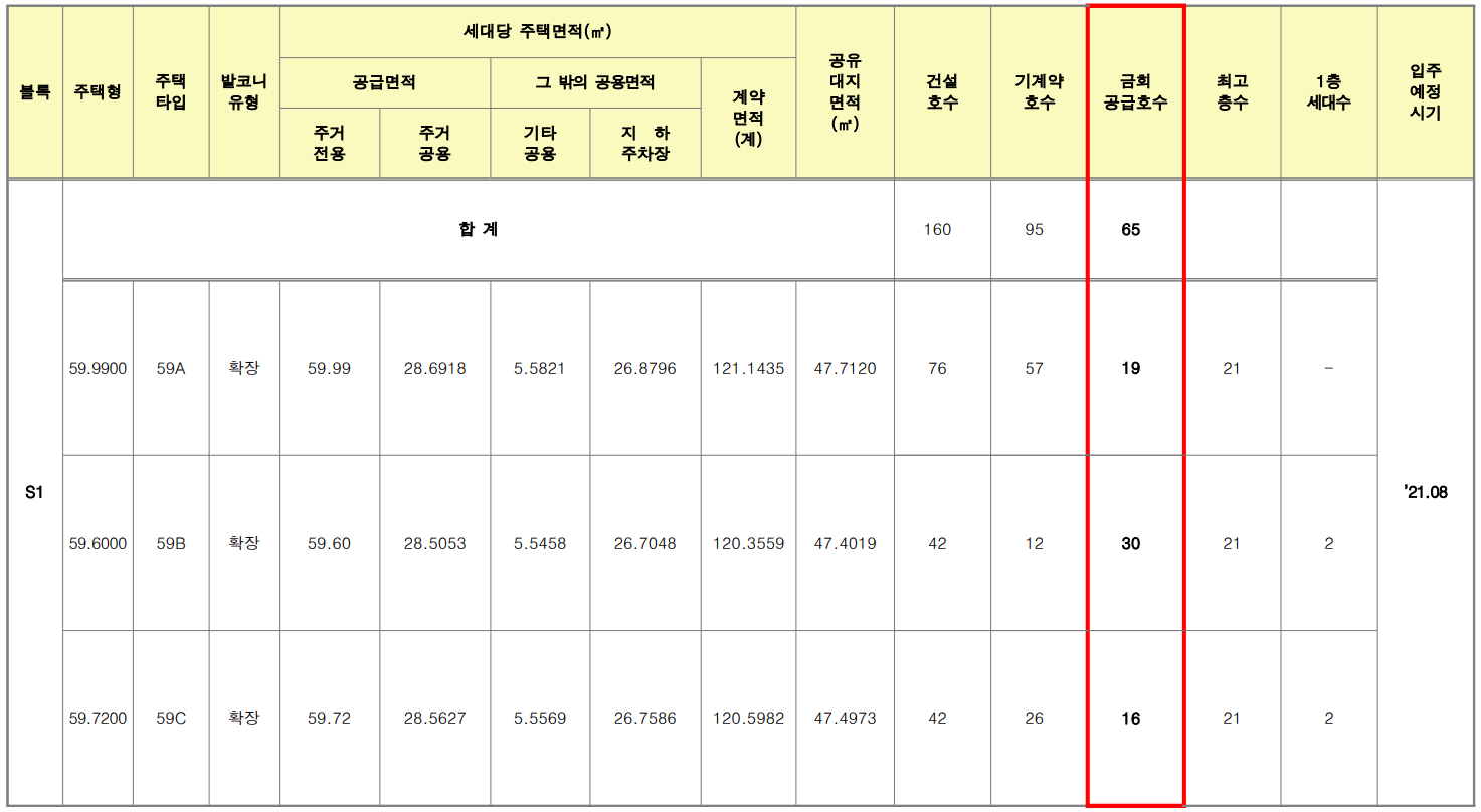 공급 대상 : 공공분양주택 160호 중 미계약 65세대 (전용면적 59㎡A 19세대, 59㎡B 30세대, 59㎡C 16세대)