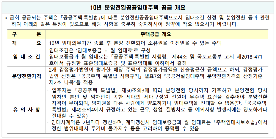 • 이 주택의 임대기간은 10년(최초 입주지정기간 종료일이 속하는 월의 다음달 1일부터 10년 이후)이며, 임대기간 종료 후 분양 전환되는 주택입니다.