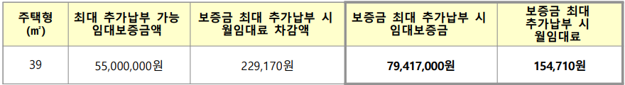 • 아래의 예시는 현재기준으로 신청자의 이해를 돕기 위한 것으로 입주시 실제 전환가능 임대보증금 및 월임대료는 예시와 다를 수 있음을 유념하여 주시기 바랍니다. 임대보증금과 월임대료 간 상호 전환 시 임대조건은 월임대료의 임 대보증금으로 전환 시(보증금 증액) 이율 연5%, 임대보증금의 월임대료 전환 시(보증금 감액) 이율 2.5% 적용하여 산정한 것이며, 향후 전환이율 변경 후 보증금의 추가납입 또는 환불이 있는 경우 그 금액에 한해 변경된 이율에 따 라 다시 산정됩니다.