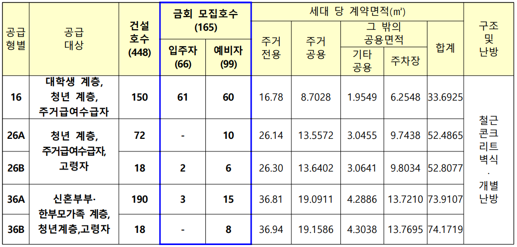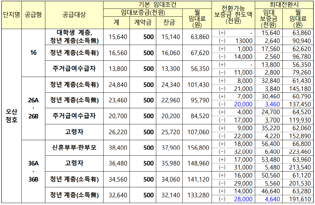 • 임대조건의 임대보증금 및 월임대료는 입주자모집공고일 현재 기준이며, 예비입주자로 선정된 분은 추후 공가가 발생하여 임대차계약을 체결하게 되는 시점의 주변시세를 반영한 변경 임대조건이 적용됩니다.