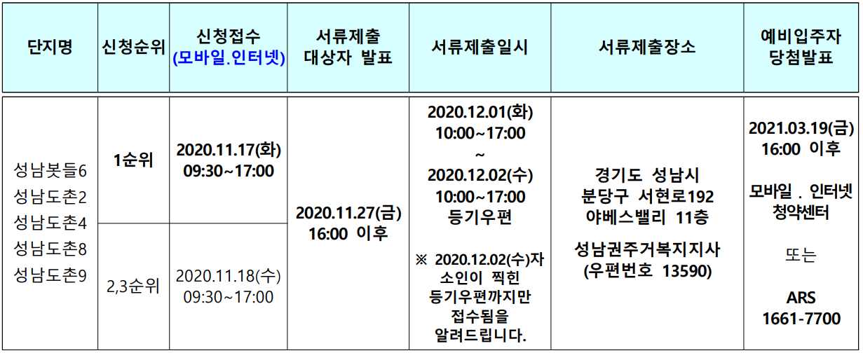 성남시 지역 국민임대주택 예비입주자 모집 공고 요약