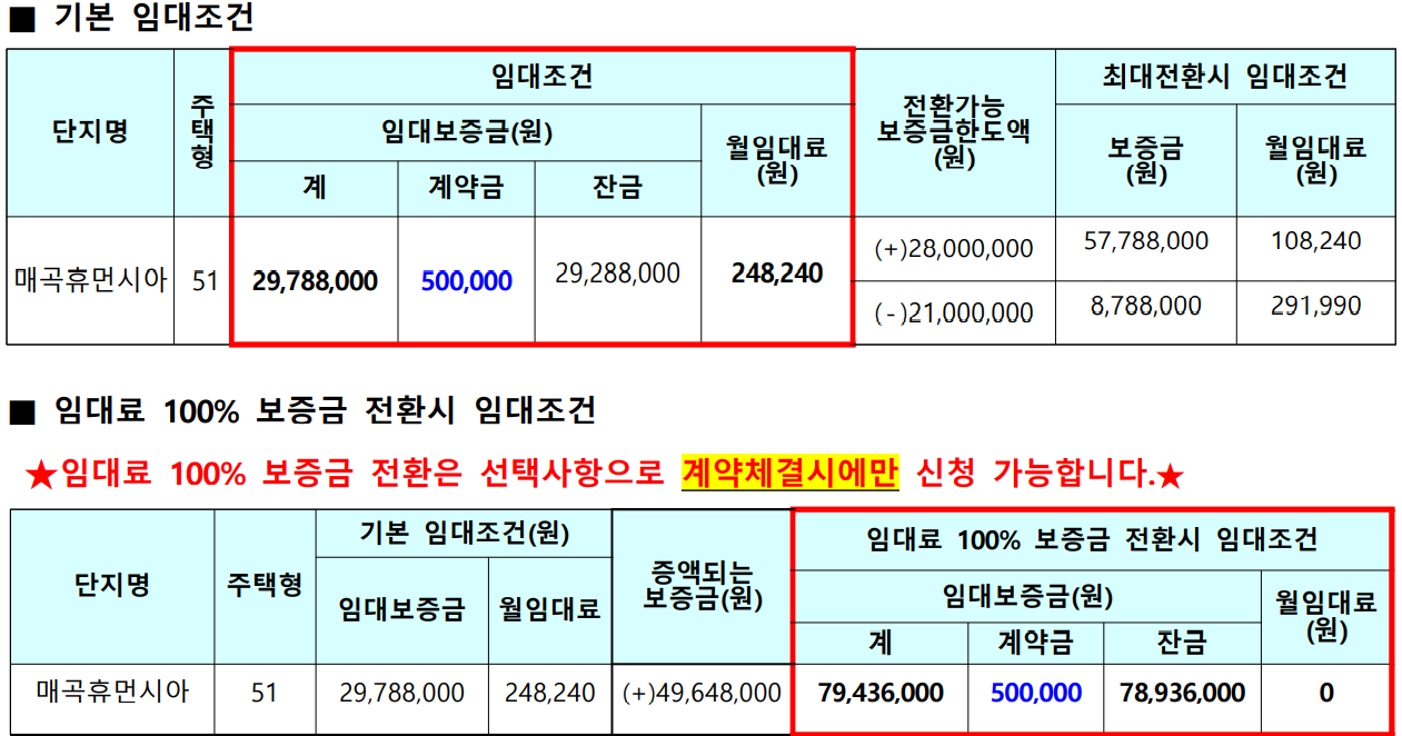 ▪ 임대조건의 임대보증금 및 월임대료는 모집공고일 현재 기준이며, 입주하는 시점에 당해 주택의 임대조건이 변경된 때에는 변경된 임대조건으로 납부하셔야 합니다.