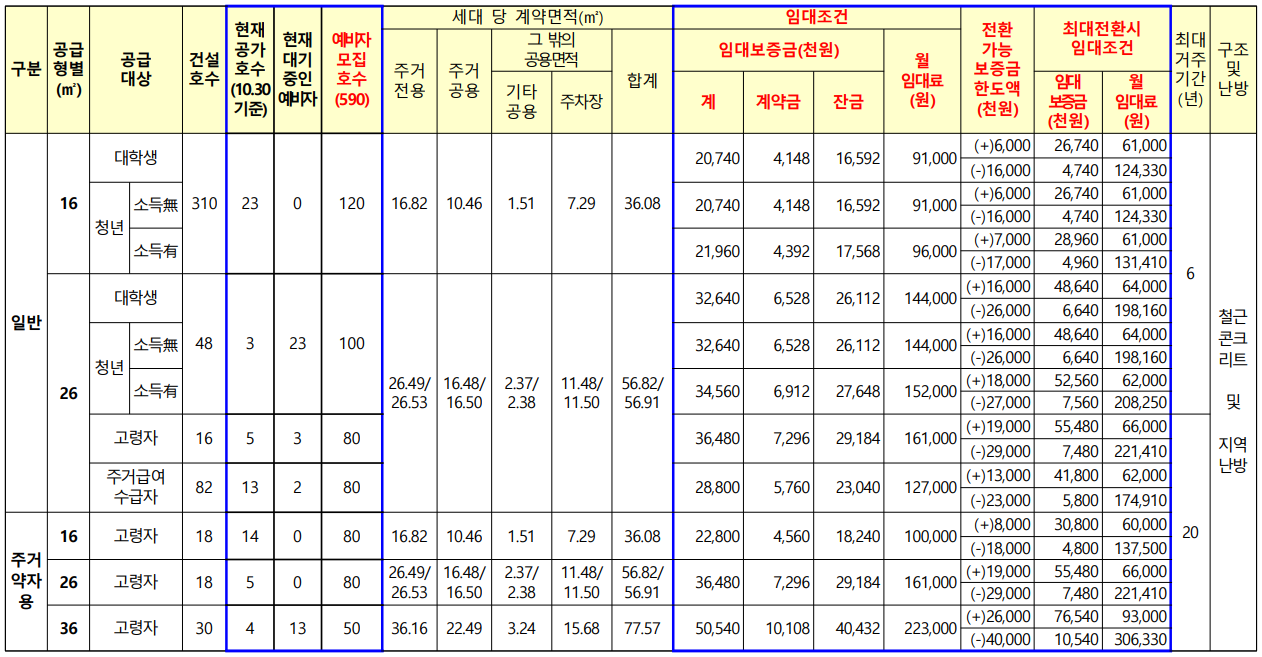 • 해당 임대주택의 공가호수 현황은 공고일 현재(10.30)기준 공개 후 변동사항에 대해 별도로 안내하지 않습니다.