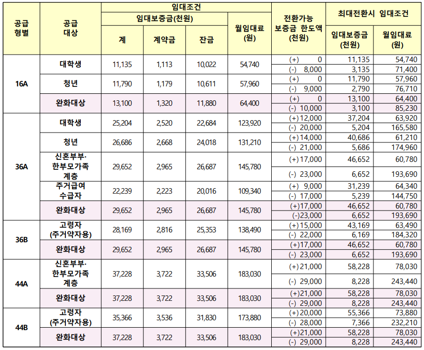 • 소득이 없는 “청년 계층” 신청자는 동일 면적의 대학생 계층 임대조건이 적용됩니다. 임대조건은 재계약전까지 유지되며 재계약시 소득 유무에 따라 변경된 임대조건을 적용합니다.