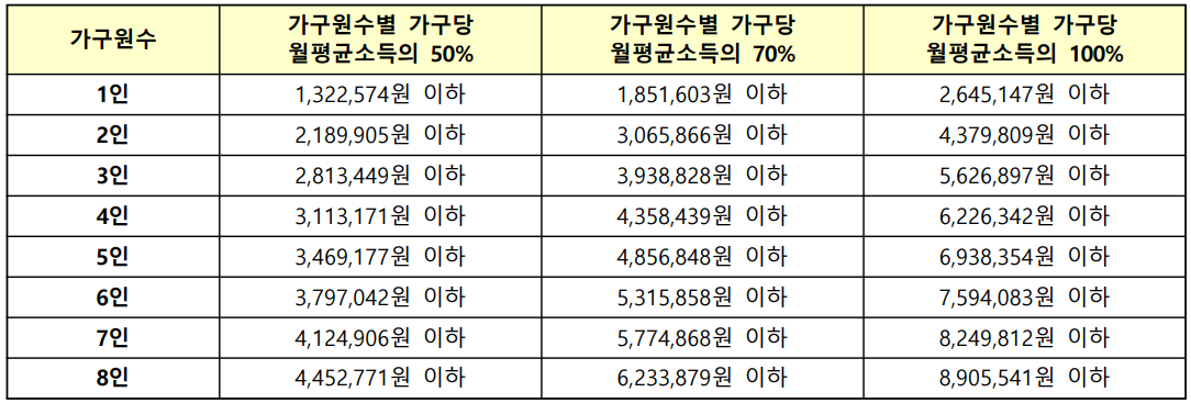 • 월평균소득액은 세전금액으로서 세대구성원 전원의 월평균소득액을 모두 합산한 금액임