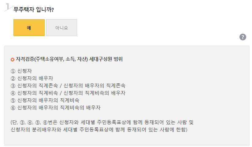 아래 자가진단 항목에서 1~3번 모두 "예"에 해당하여야 하고, 자동차를 보유하고 있다면 4,5번 항목도 "예"일 경우 국민임대주택 입주자격이 됩니다.