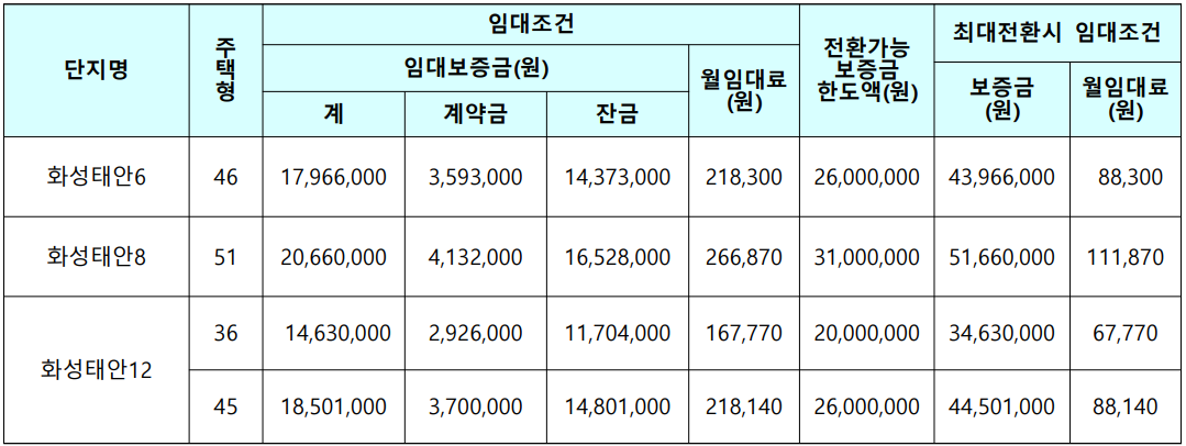 ▪ 임대조건의 임대보증금 및 월임대료는 모집공고일 현재 기준이며, 예비입주자로 선정된 고객께서 임대차계약 을 체결하는 시점에 당해 주택의 임대조건이 변경된 때에는 변경된 임대조건으로 계약하셔야 합니다.