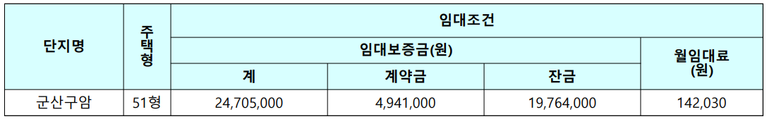 ▪ 임대조건의 임대보증금 및 월임대료는 모집공고일 현재 기준이며, 예비입주자로 선정된 고객께서 임대차계약 을 체결하는 시점에 당해 주택의 임대조건이 변경된 때에는 변경된 임대조건으로 계약하셔야 합니다.