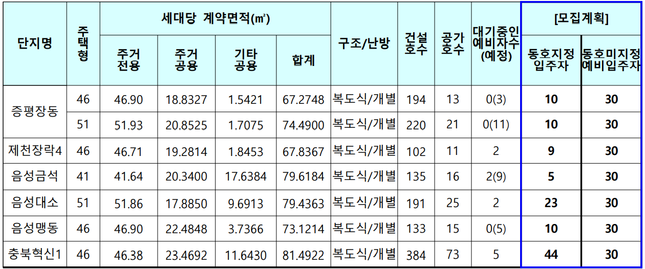 증평장동, 제천장락4, 음성금석, 음성대소, 음성맹동, 충북혁신1 국민임대주택 입주자격완화 입주자 모집 공고 (선착순 동호지정 현장접수)
